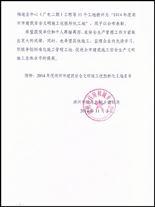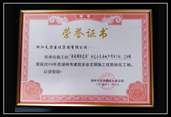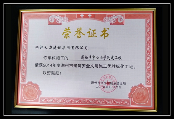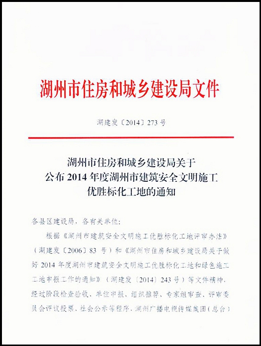 道場鄉中心小學遷建工程、美來國際花園住宅小區房地產項目19#、22#樓榮獲2014年度湖州市建筑安全文明優勝標化工地