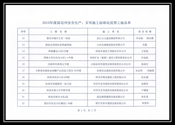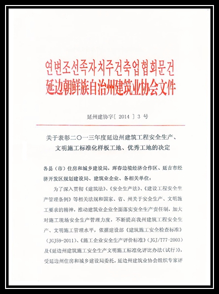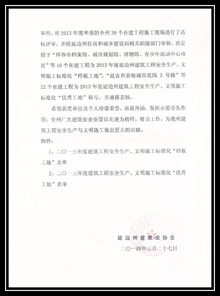 2013年度延邊州建筑工程安全生產(chǎn)、文明施工標準化樣板工地、優(yōu)秀工地