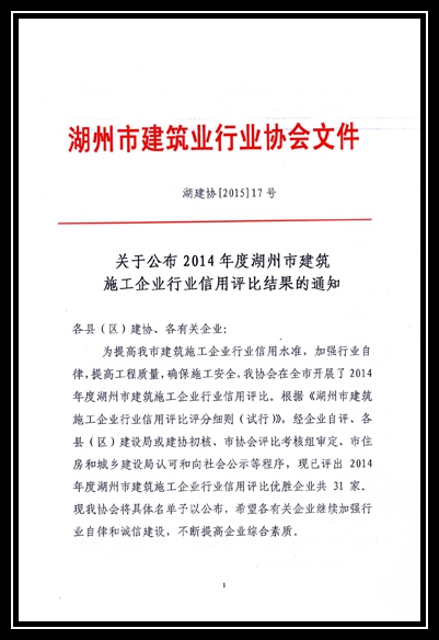 2014年度湖州市建筑施工企業(yè)行業(yè)信用評比優(yōu)勝企業(yè)