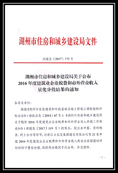 2016年度建筑業企業稅費和市外營業收入量化分值結果的通知
