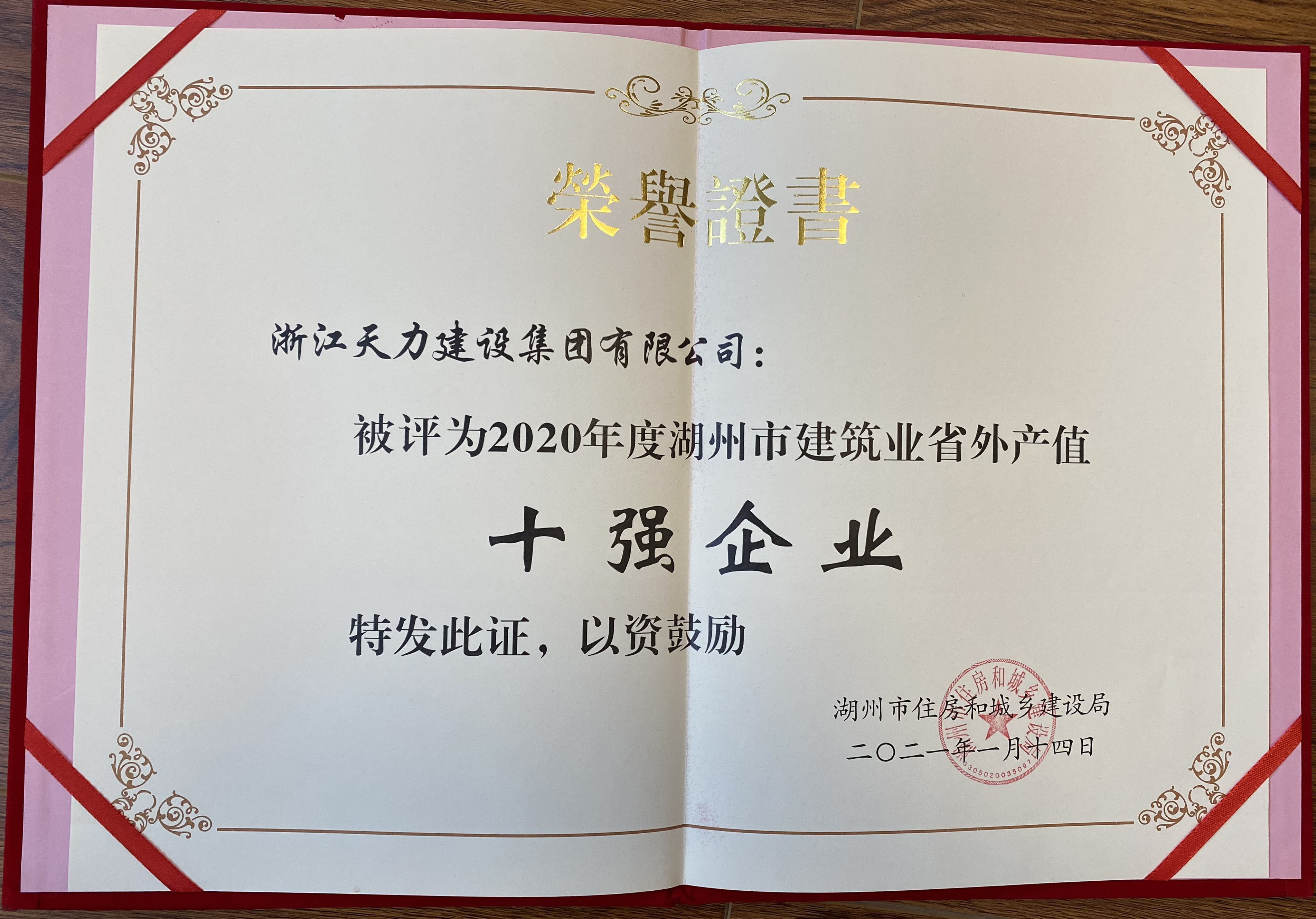 2020年度湖州市建筑業(yè)省外產(chǎn)值十強(qiáng)企業(yè)