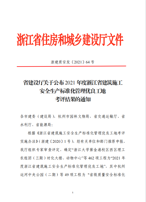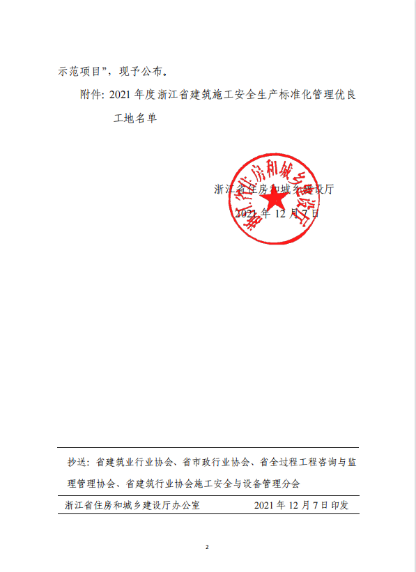2021年度浙江省建筑施工安全生產(chǎn)標(biāo)準(zhǔn)化管理優(yōu)良工地