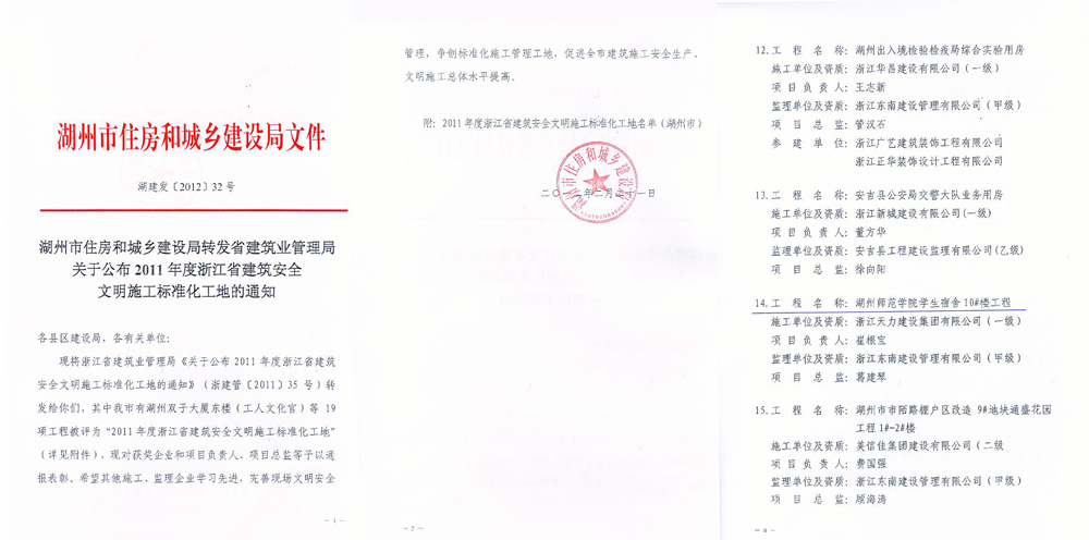 湖州師范學(xué)院學(xué)生宿舍10#樓被評為2011年度浙江省建筑安全文明施工標(biāo)準(zhǔn)化工地