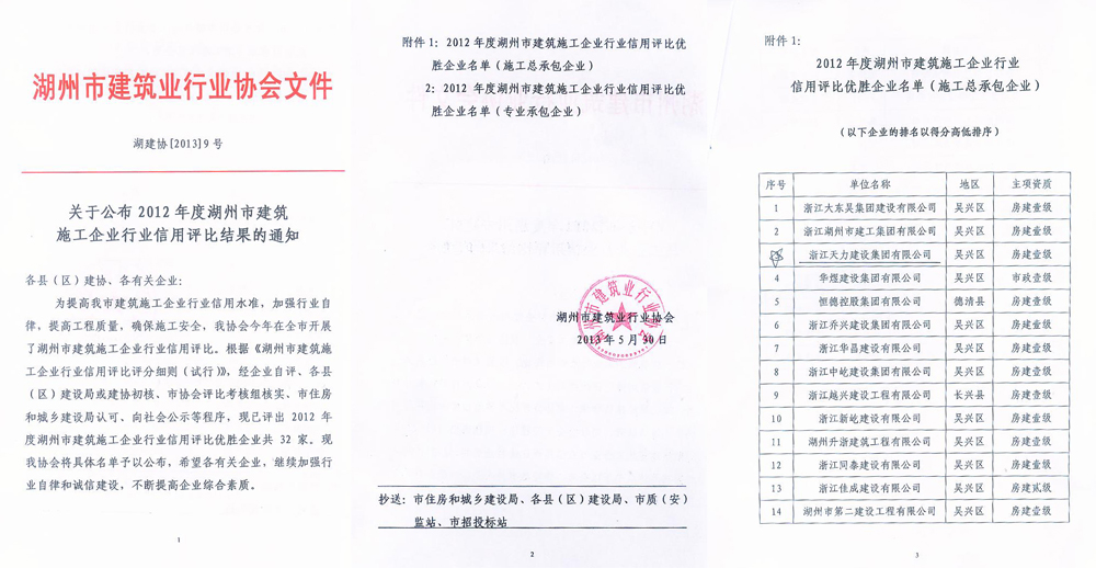 2012年度湖州市建筑施工企業(yè)行業(yè)信用評(píng)比優(yōu)勝企業(yè)